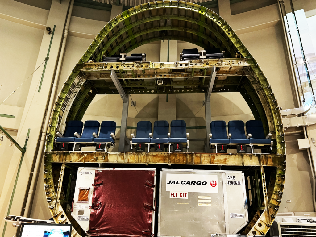 本物のジャンボジェットを輪切りにした展示が!飛行機ってこういう構造になっていたのかと驚きでした。