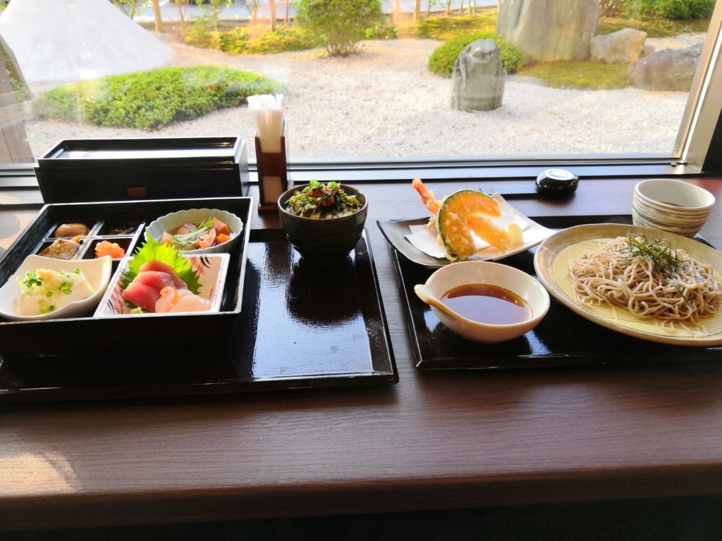 「食事処 天の川」では日本庭園をながめながら食事を楽しめます。天の川御前はボリューム満点で大満足!お風呂上りにビールとおいしい食事…至福のひと時です。